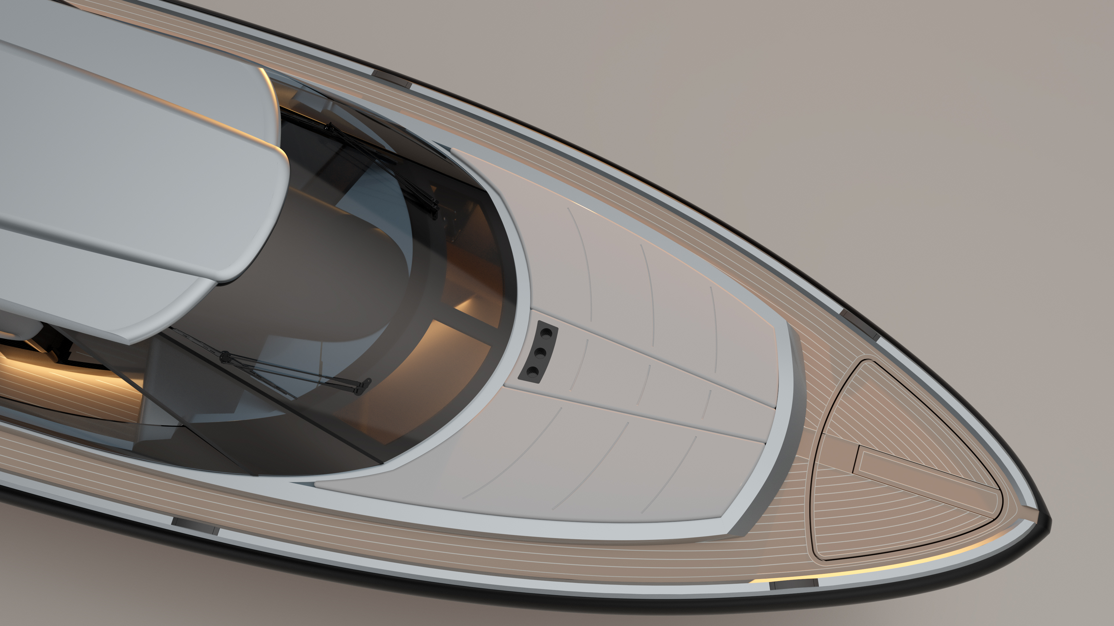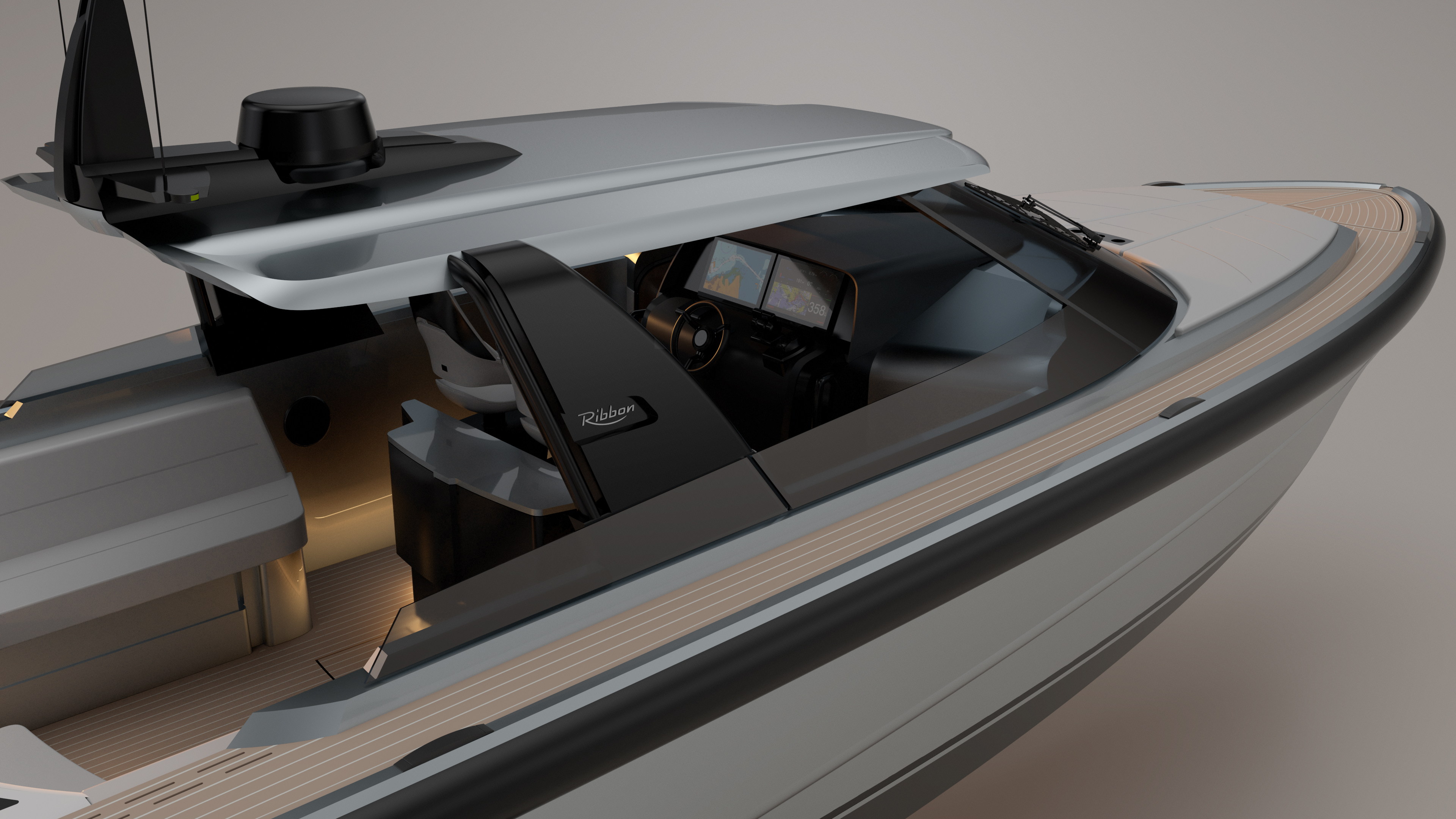 The Ribbon 45 can be operated from three luxurious carbon cockpit seats with our suspension system which are located behind a windscreen and well protected from the heat of the sun by a carbon hard top. The carbon dashboard with Garmin GPSMAP 8400 multi touch displays are ergonomically designed with the need of the helmsman in mind. behind the seats there is an outdoor galley with room for a large fridge and sink.